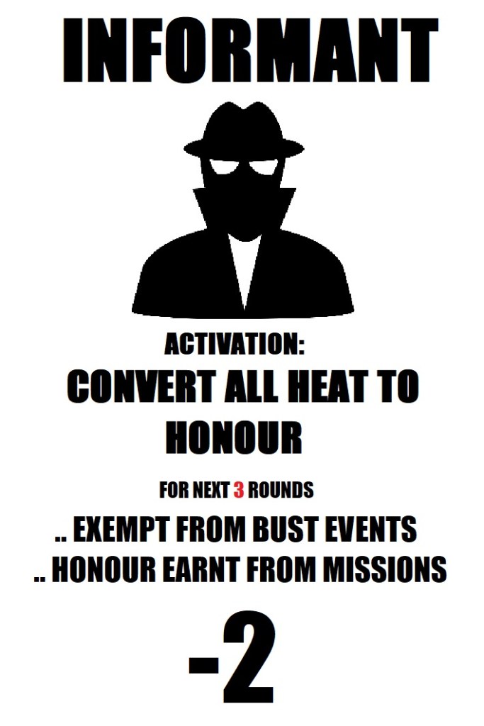 This research has led me to implement the “Informant” action of the game. As an action, at any time during the game, a player is allowed to become an informant to the police, which offers them a straight up bonus of Honour points (which is Victory condition of the game), and an on-going bonus which exempts them from Bust events, helping the player to preserve Honour points. The other players instead will receive an on-going penalty throughout the duration that the “informant” status is in effect (3 rounds). This effect may only be played once per game per player, and is entirely optional. Initial play tests have proven that the effect helps achieve what I wanted – an invisible and constant threat that can initiate at any time, by anyone. There is no big set up to pull this off, and no warning to the players, purely based on the musings or vendetta of another player.